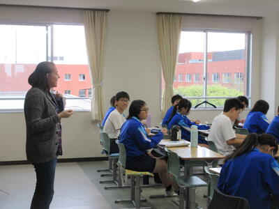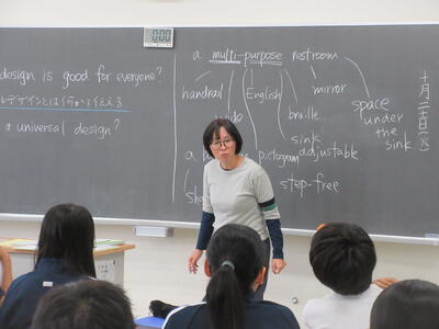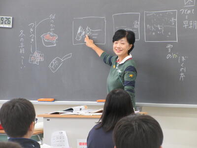 ▼3年生の英語の授業。単語の意味確認では、腰越先生とクリスティン先生が分かりやすく説明していきます。