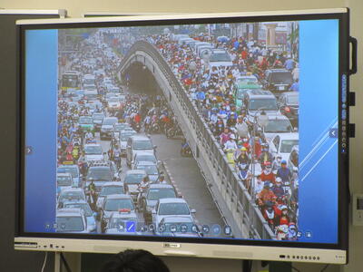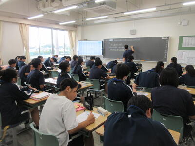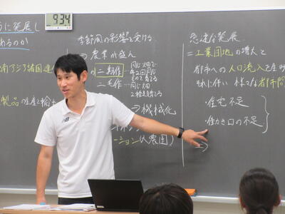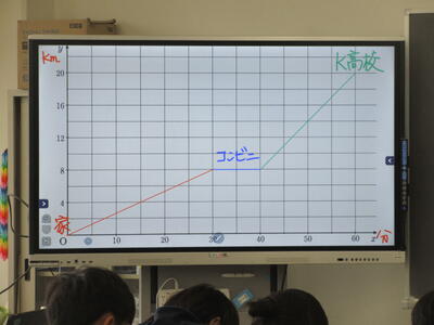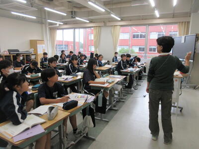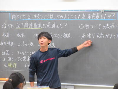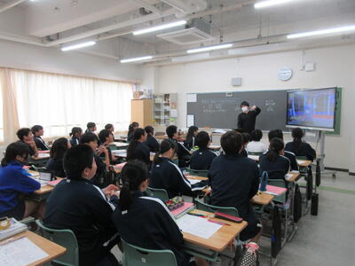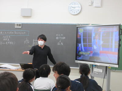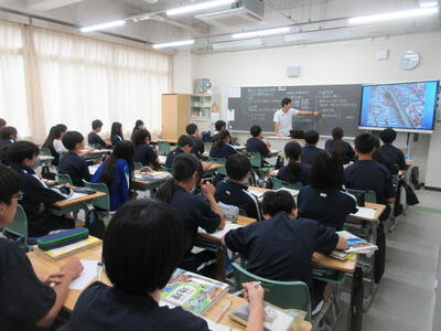 ▼1年生社会科の授業。様々な資料を提示し子ども達に考えさせる佐藤先生の授業。1年生、英語の授業同様、実によく反応していきます。