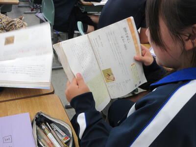 ▼2年生の国語の授業。コミュニケーションスペースでは、枕草子や徒然草などの読みのテストが行われています。教室内では子ども達が互いに確認しながら、ものすごい勢いで練習。