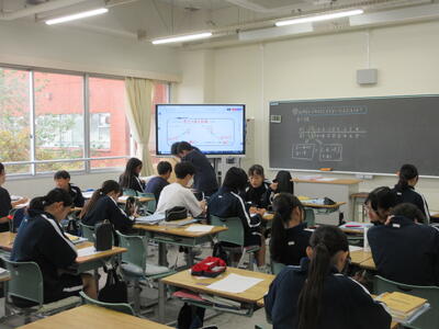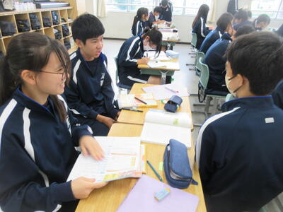 ▼1年生数学の授業。熱心に学び合いをする子ども達の姿が広がります。こうして学びが深まっていきます。