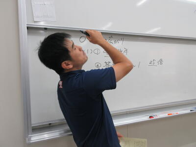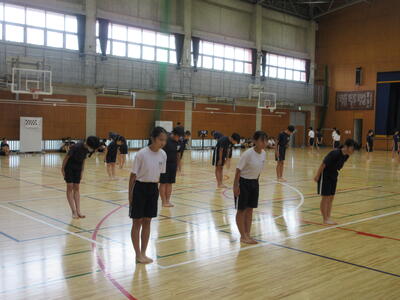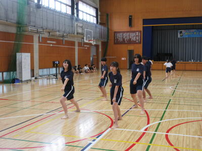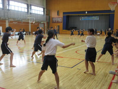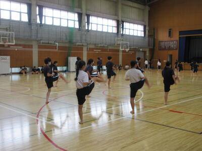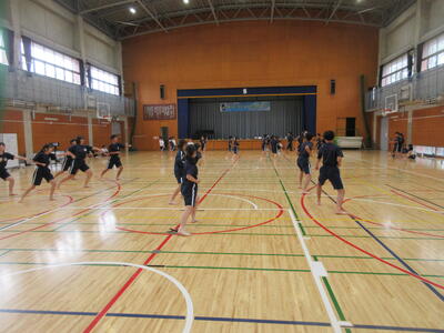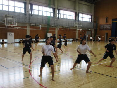 ▼第1体育館では、2年生が男女一緒に空手の型の練習を行っています。タブレットで撮影して互いに評価。自分の動きを客観的に捉えることで、さらなる飛躍を遂げます。元気なかけ声が体育館中に響き渡ります。