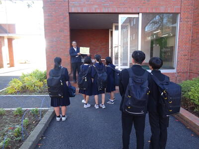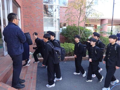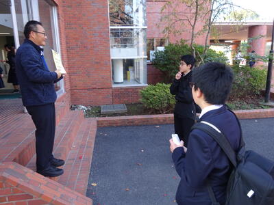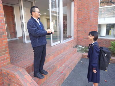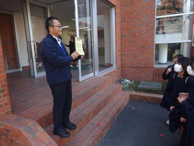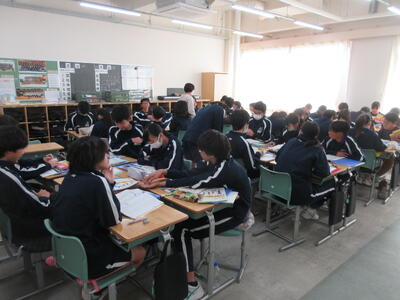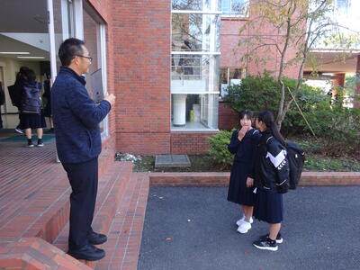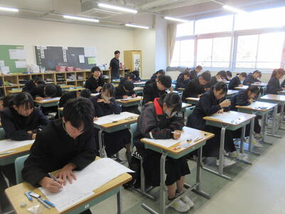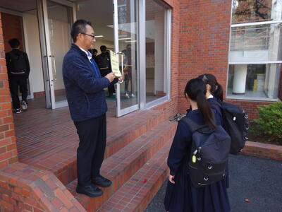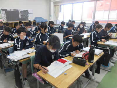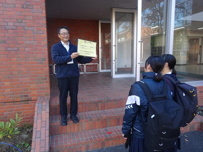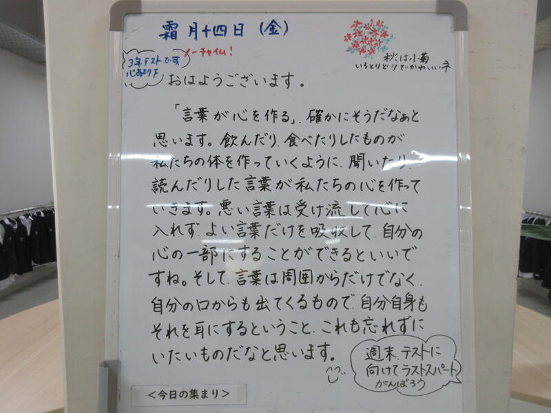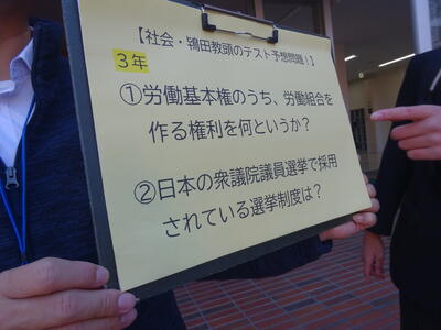今朝の南流中は秋晴れの穏やかな陽射しが降り注ぎます。A棟1階3年生の昇降口前には鴇田教頭先生が立って、登校してきた3年生の子ども達に、本日行われる後期中間試験の社会科予想問題を提示し、最後の追い込みの後押しをしています。教頭先生の予想問題はよくあたる と評判のため、立ち止まって確認する生徒も大勢!!さあ、予想問題は的中したのでしょうか??