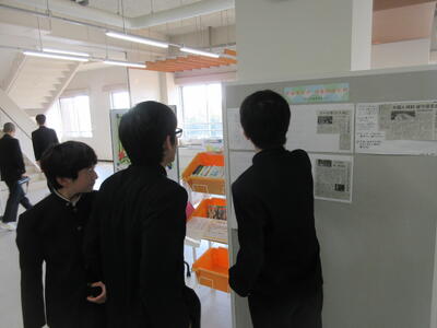 ▼A棟2階の掲示板前。広報委員会が作成した社会科時事問題の予想を確認する子ども達。さて、広報委員会の予想問題も的中したのでしょうか??