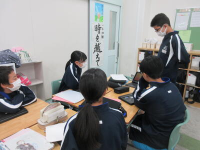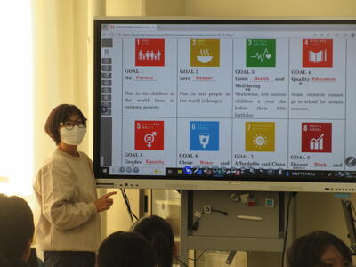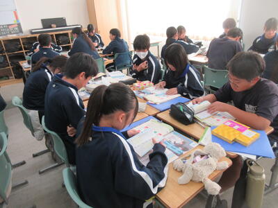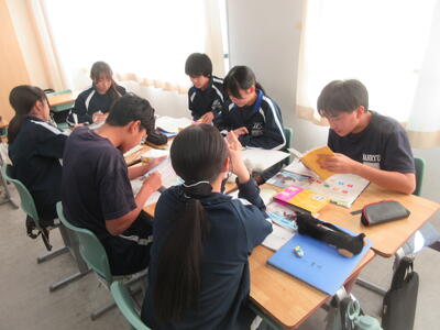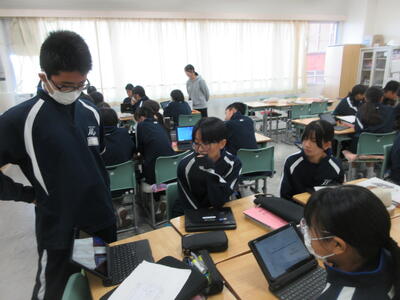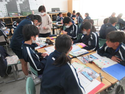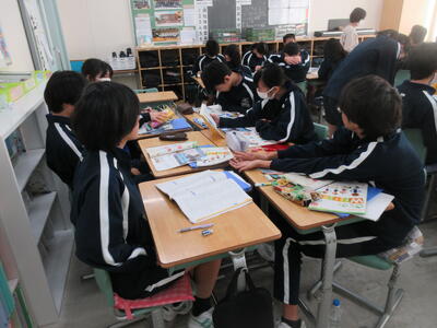▼英語の授業の様子。SDGsについてのグループごとの発表準備を行っています。辞書とにらめっこしながら表現を確認。英語を活用しながら、社会科についても学習する子ども達。教科横断的な授業が展開されています。