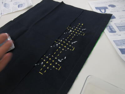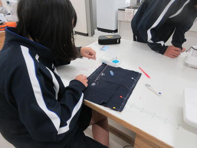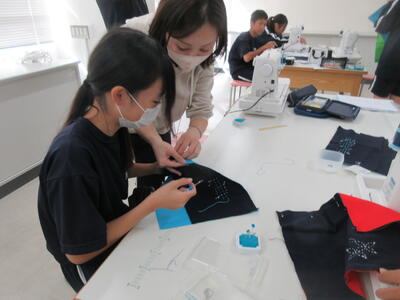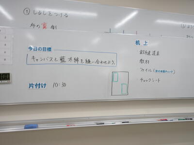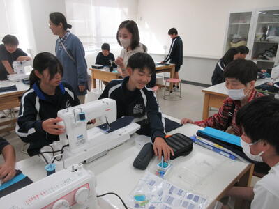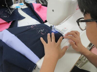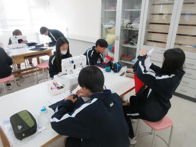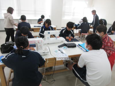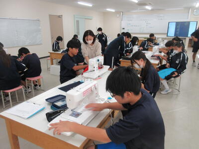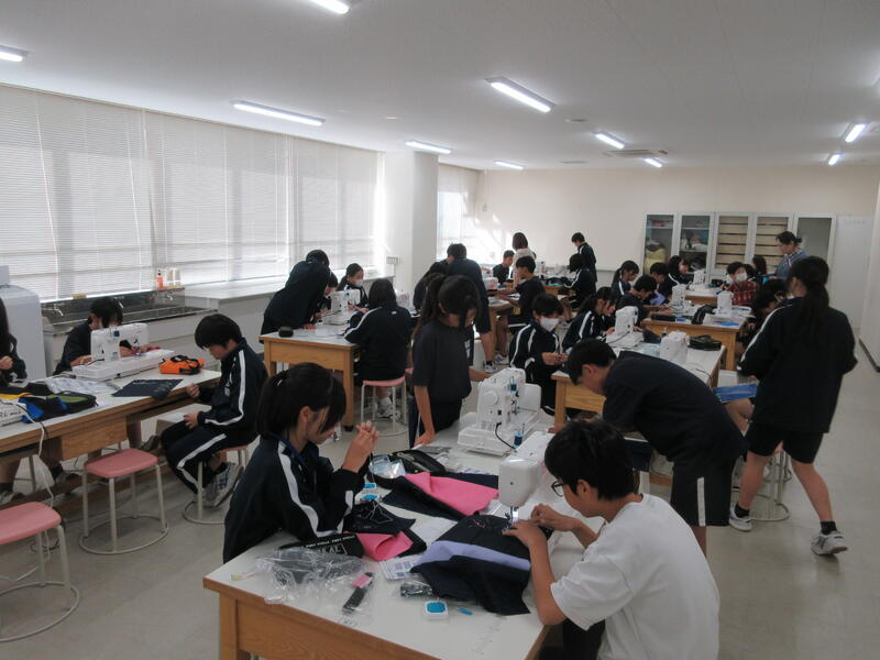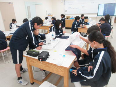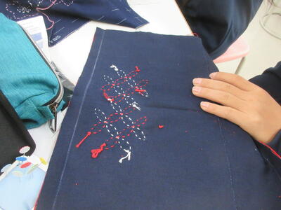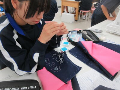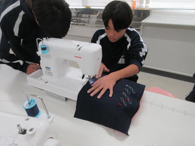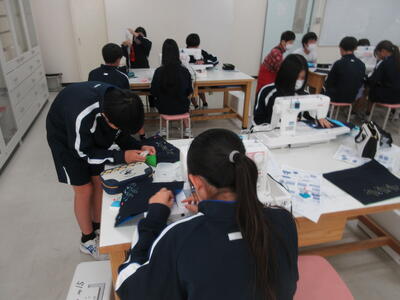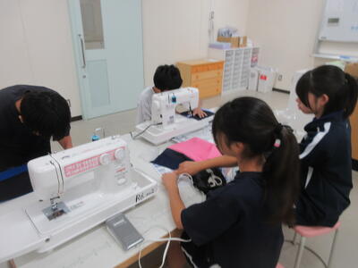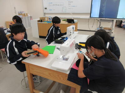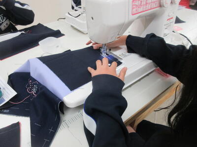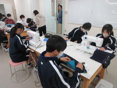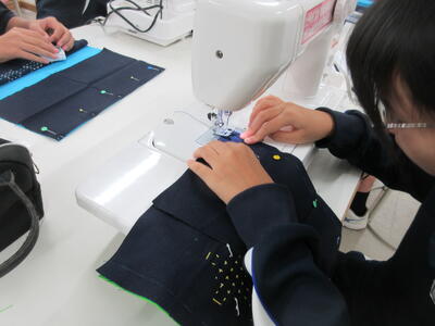 ▼被服室では、1年生の子ども達が「キャンバスと藍木綿を縫い合わせよう」のテーマで作業に集中。世界で一つだけの、自分だけの「ランチトートバッグ」を作り上げていきます。家庭科的な作業の上達は当然ながら、集中力も鍛えられています。