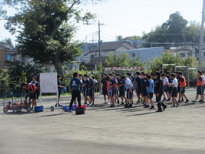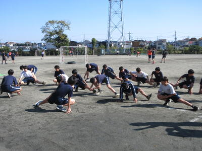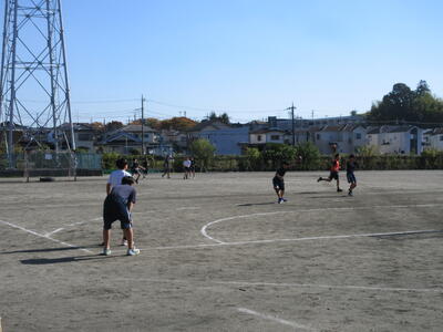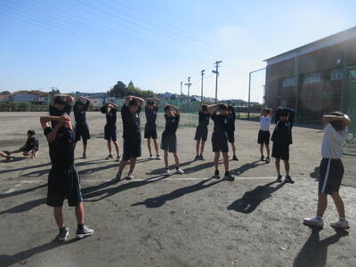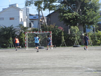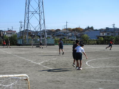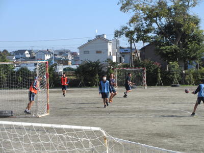 ▼暖かな陽射しを浴びた第1グラウンドでは、子ども達がハンドボールの準備運動を元気よく行っています。