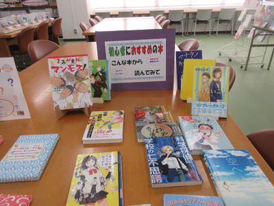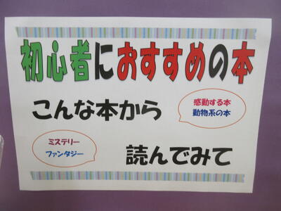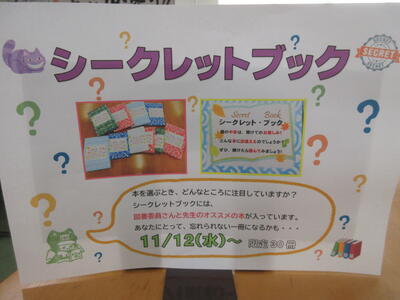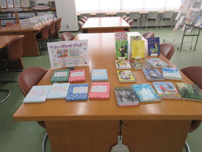 ▼図書館司書の田中明美先生が企画した様々な試み。「シークレットブック」コーナーと、「初心者におすすめの本」コーナー。シークレットブックは大評判で、残りは僅か7冊。南流中のみんな、うちの学校自慢の図書館をどんどん利用してね!!