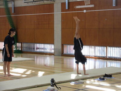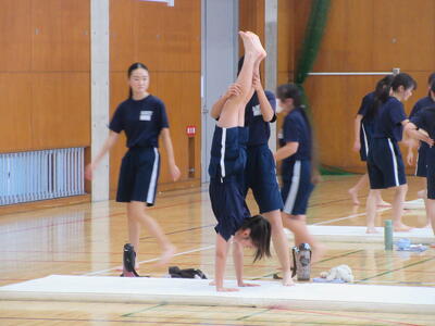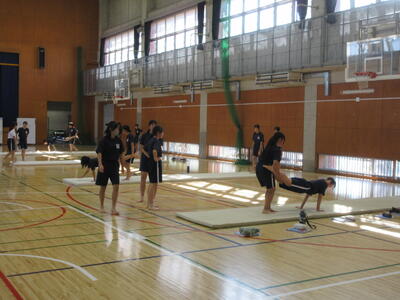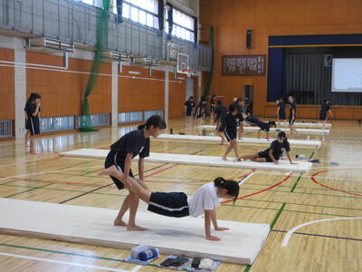 ▼第1体育館ではマット運動の授業。協力しながら準備運動を行っています。