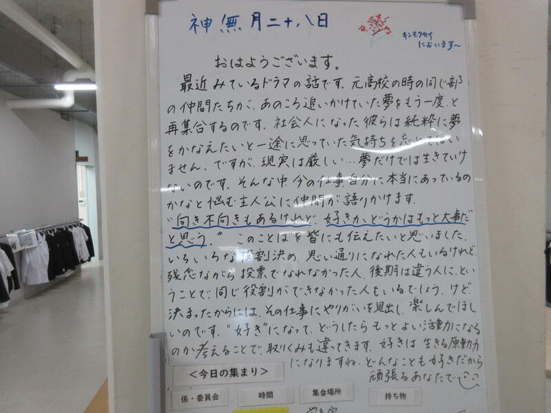 ▼C棟2階のホワイトボード。河崎先生からのメッセージが書かれています。「好きは生きる原動力」の言葉。本当にその通りだと思います。いろんなことに興味を持ってまずはやってみること。その中から楽しさを見つけていくこと。そうした積み重ねが、まさに「生きる原動力」、そして成長に繋がるんだと思います。