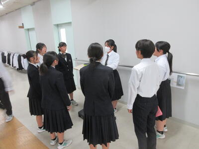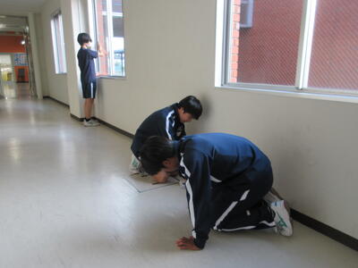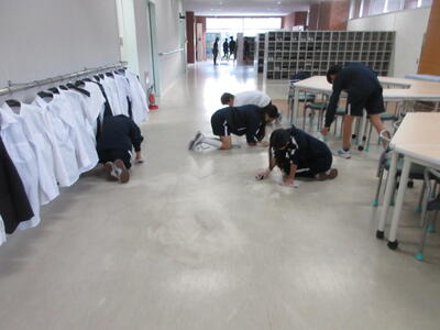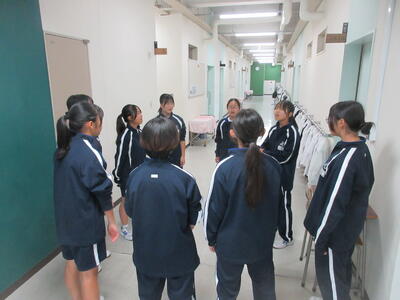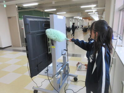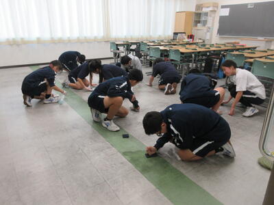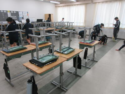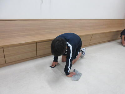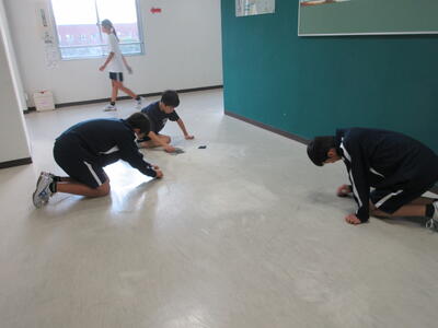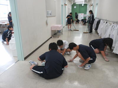 ▼清掃中の2年生や1年生の様子。清掃分担場所が遠いため、近くに3年生の姿は見えません。それでも、1、2年生は、これが3年生から受け継いだ大切なバトンであるかのように、黙々と清掃に取り組みます。これこそ南流中の伝統の力です。
