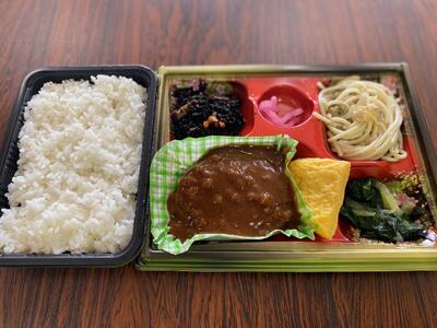 ▼今日が最後のお弁当給食の日。メニューは、ハンバーグ デミグラスソース、ボンゴレスパゲティ、青梗菜の塩炒め、オムレツ、ひじき煮、香の物、ごはん。