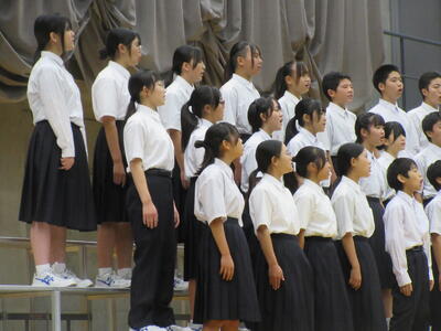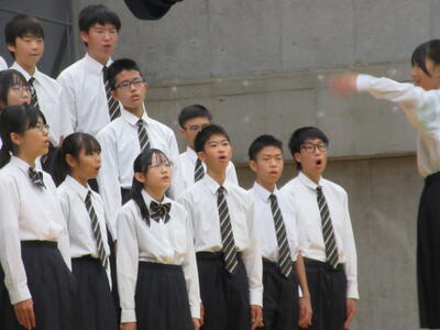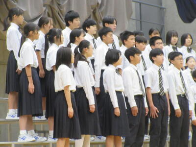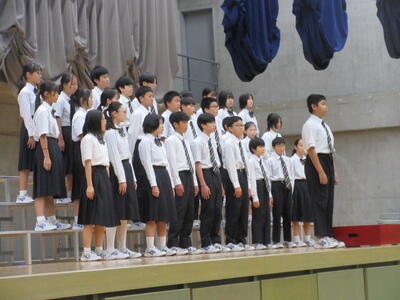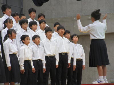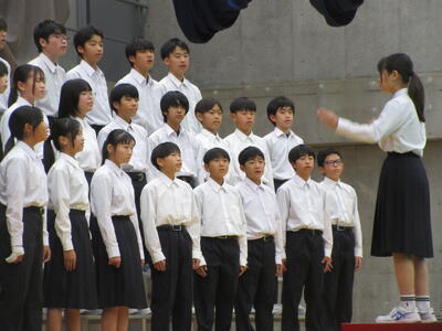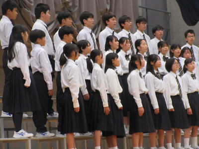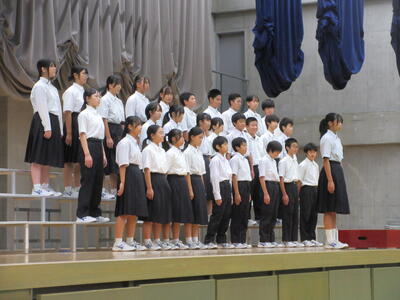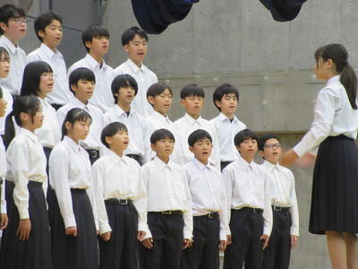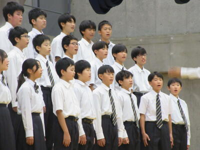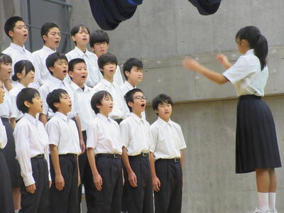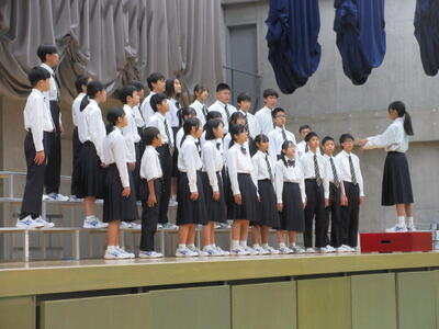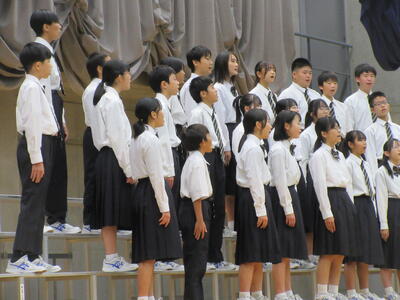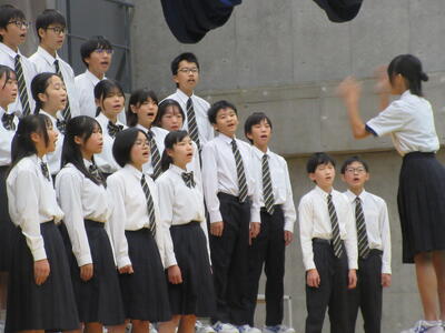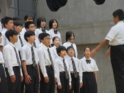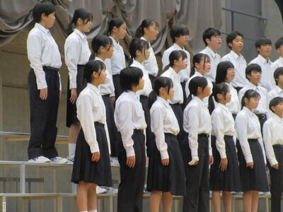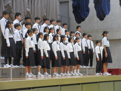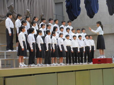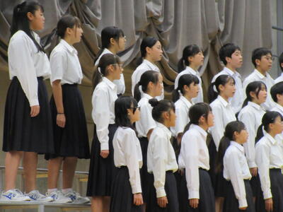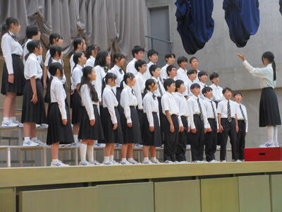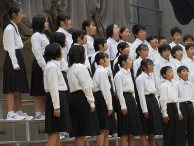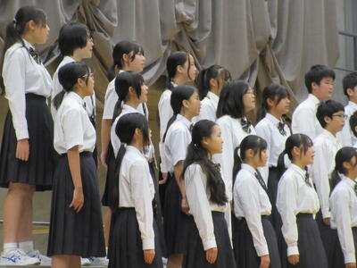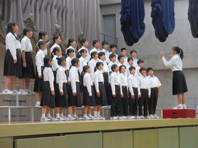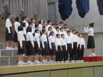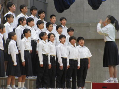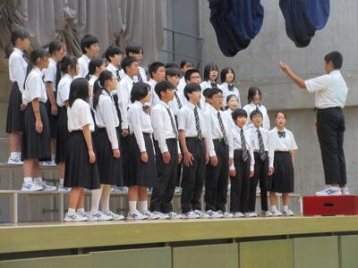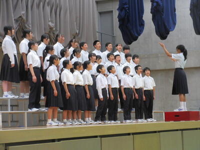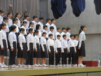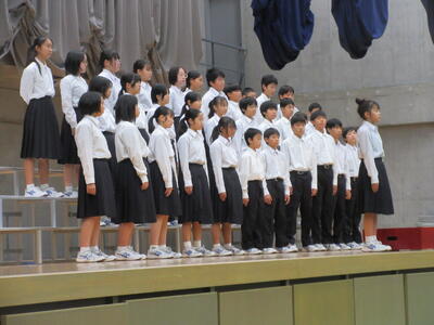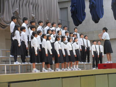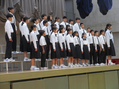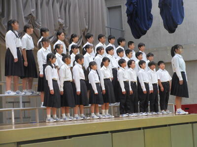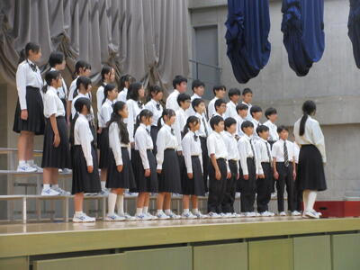 ▼全校合唱の「Let's Search for Tomorrow」。素晴らしい歌声が会場を包みます。このコンクールに臨む子ども達の心の高まりを感じます。