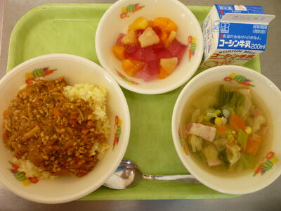 今日の給食は【キーマカレー、野菜スープ、フルーツのぶどうゼリーあえ、牛乳】です。