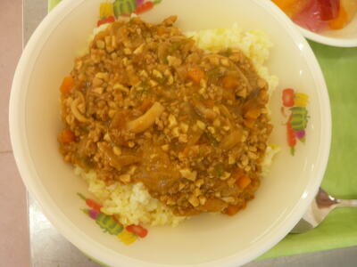 「ドライ」という名前の通り、汁気のほとんどないカレーを指します。今日のカレーはひき肉と一緒に、たっぷりのみじんぎり野菜をよく炒めてから煮詰めて、さらに砕いた大豆を加えて作りました。大豆は「畑の肉」といわれるほど、良質なたんぱく質を含みます野菜の甘みと大豆の食感を味わいながら食べましょう。