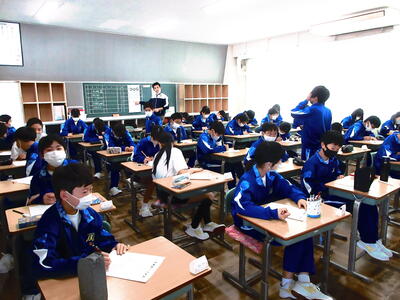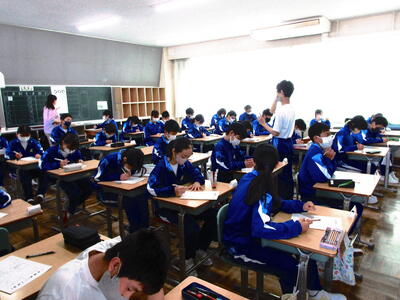 今日の午前中も3年生は授業に集中して臨んでいました。一方2年生は各教室で一人ずつ視力検査。