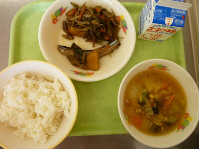 今日の給食は【ごはん、さんまのしょうが煮、くきわかめのきんぴら、北海汁、牛乳】です。