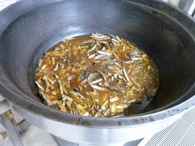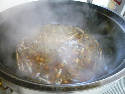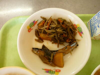 9月の給食では、さんまを甘辛いタレと一緒に、ごはんに混ぜた「さんまごはん」を出しましたが、今日はしょうがたっぷりの煮魚です。煮魚は、近頃家庭料理で食べる機会が少なくなっているかもしれません。今日のさんまは、たっぷりのしょうがを使った香りの良いだし汁で、調理員さんが朝からじっくりと煮ています。ほろほろとした食感と、味の染みこんだ身を味わって食べましょう
