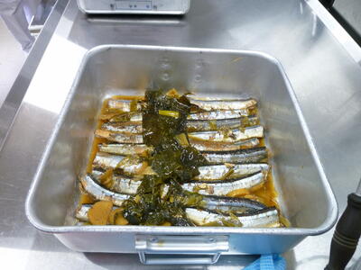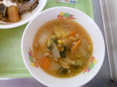 朝、正門を通過すると、学校中がお出汁の香りに包まれていました。優しい懐かしさもあるお出汁の香りから、生徒達が香りを嗅ぐことも立派な食育だと思いました。「今日の給食は何だっけ。」「早く食べたいな。」など、生徒達の心にぽっと膨らんだ給食に対する思いが、給食への興味関心を深め、学校での日常会話の中に献立の話が出てくる。こういうことが自校で作っている給食の良さかも知れません。朝から時間をかけてゆっくり煮込んだ「さんまのしょうが煮」は、口に含むと骨までホロホロに砕けて、ご飯と一緒に食べていたはずが、いつの間にかご飯が足りないぐらいでした。また、しょうがにも味がしみ込み大満足でした。「くきわかめのきんぴら」もボリュウームがあり、くきわかめのシャキシャキした食感が楽しくて、さんまとの相性も抜群でした!!「北海汁」は、北海道のイメージで大きめのじゃがいもを中心に、とうもろこしや色彩豊かな野菜がたっぷり入った汁物でした。今日も栄養教諭の先生、調理員の皆さん、最高の給食を作ってくださり、ありがとうございました!!