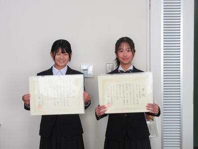 この取り組みにおいて、本校の佐藤千咲さん(2年)の標語『あいさつは「いつでも」「どこでも」「だれにでも」』が最優秀賞に、また、鵜飼華穗さん(2年)が佳作にそれぞれ入賞し、賞状が授与されました。おめでとうございます!!