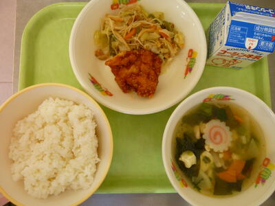 今日の給食は【ごはん、ヤンニョムチキン、焼きビーフン、大根とわかめのピリ辛スープ、牛乳】です。