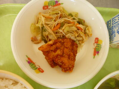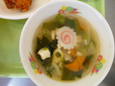 今日は韓国と中国料理の見事なコラボレーション!!「ヤンニョムチキン」は、甘辛い味付けでご飯がとても進みました。一気に食べるとすぐなくなってしまうので、少しずつ味わいながらいただきました。栄養士の先生の説明にあった自慢の「焼きビーフン」は、自慢するだけあって、ボリュームがあり、とってもおいしかったです。「大根とわかめのピリ辛スープ」は、パンチの効いた味つけと柔らかくてとろけるような野菜の入ったスープで、水分もしっかり摂ることができました。今日も栄養教諭の先生、調理員の皆さん、おいしい給食を作ってくださり、ありがとうございました!!
