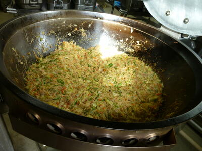 ビーフンの起源は古く、紀元前220年頃、秦の始皇帝が中国統一を成し遂げた頃の中国南部と考えられています日本に初めて伝わったのは、明治36年の現在の万博に相当する博覧会でした。実際に家庭でビーフンが食べられるようになったのは戦後であり、現在は特に九州地方での個人消費量が多いと言われています。今日はたっぷりの野菜とベーコンのうま味がよく染みこんだ焼きビーフンにしています。よくかんで食べましょう。