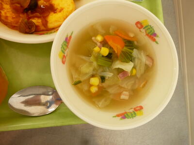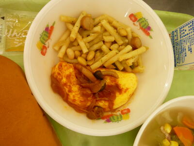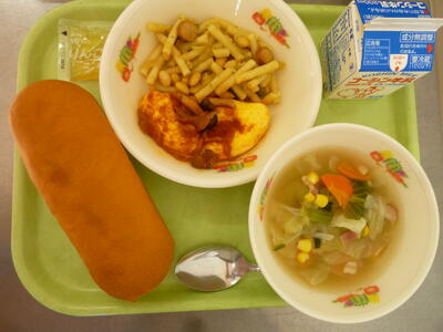 今日の給食は【コッペパン、りんごジャム、オムレツのきのこソースかけ、豆のスパイシー炒め、野菜スープ、牛乳】です。