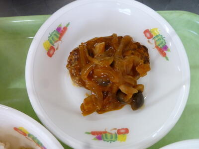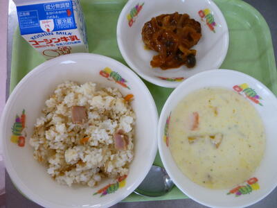 今日の給食は【ごぼうピラフ、デミグラスハンバーグ、かぼちゃのクリームシチュー、牛乳】です。