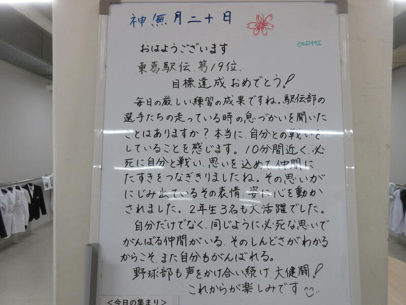 ▼C棟2階のホワイトボード。2学年主任の渡邉久子先生からの温かい言葉が書かれています。