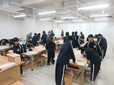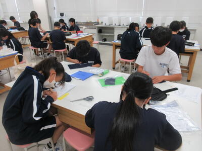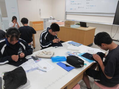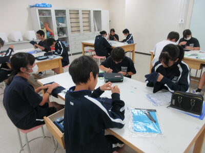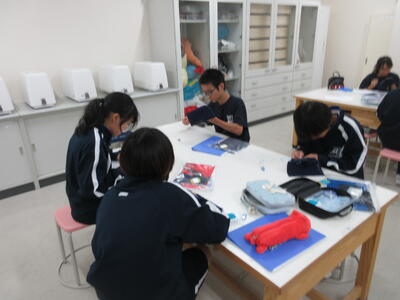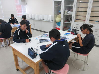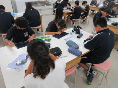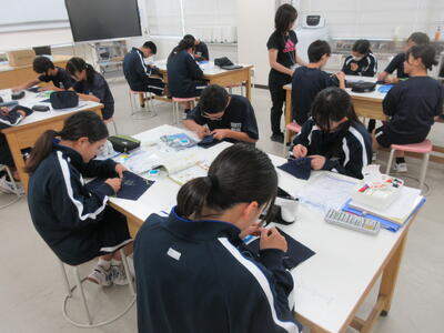 ▼被服室で行われている家庭科の授業。どの子もものすごい集中力で作業に取り組んでいます。
