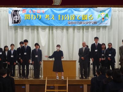 着任式では、転入職員が生徒達からの温かい拍手に迎えられて入場した後、生徒会執行部による素晴らしい歓迎の言葉、そして最後は2・3年生による歓迎の歌「南風」が披露されました。新2・3年生による感動的で見事な合唱が体育館中に響き渡りました。