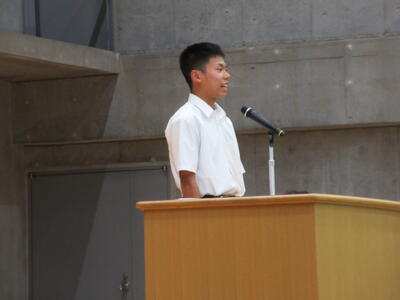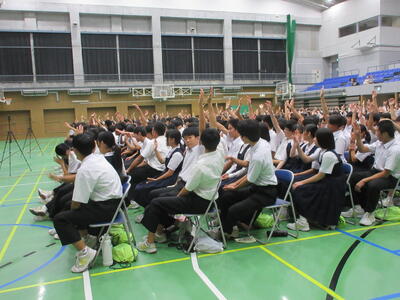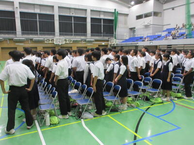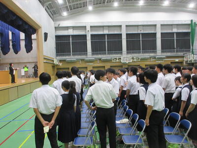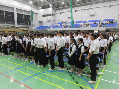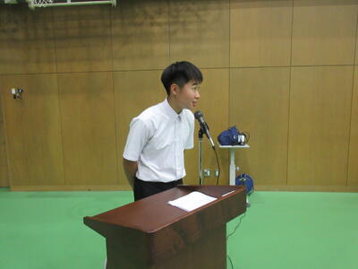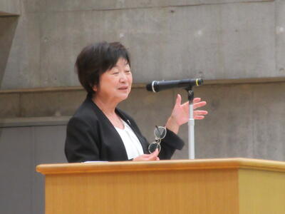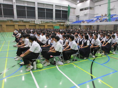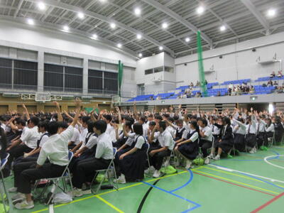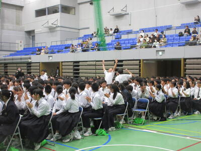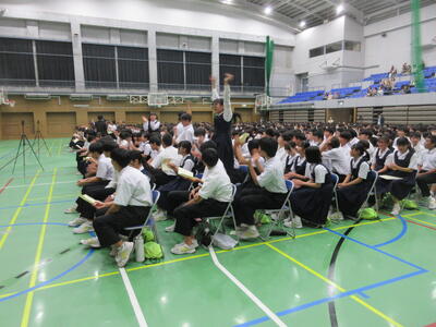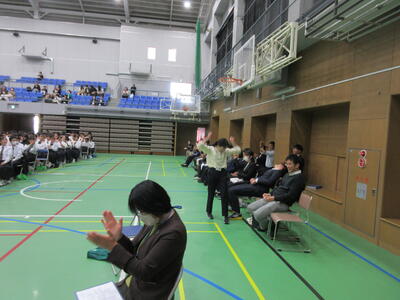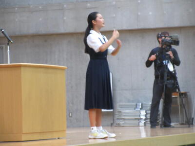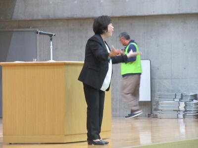 ▼開会の言葉。そして審査員の大野伸子先生から講評をいただきました。大野先生、本日は大変お忙しい中、本校にお越しくださり、また、審査・ご指導いただき、ありがとうございました!! 南流中の子ども達、先生の教えを胸にワンランクもツーランクも向上するために頑張ると思います。本当にありがとうございました!!