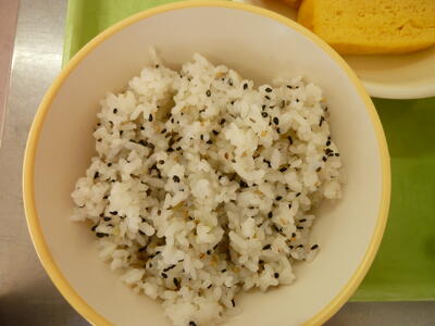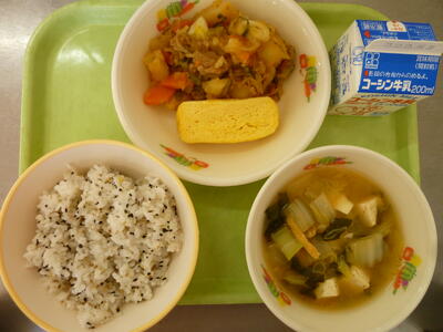 今日の給食は【黒ごまごはん、厚焼き卵、ねぎすきじゃが、白菜と油揚げのみそ汁、牛乳】です。