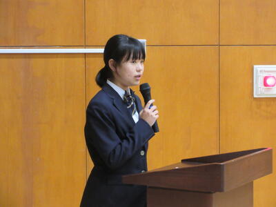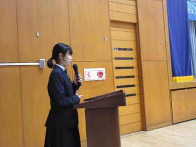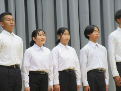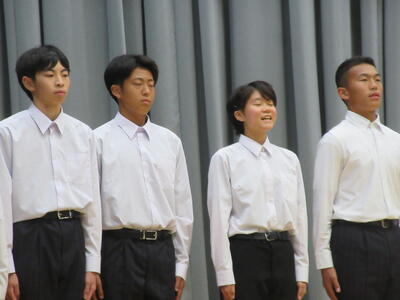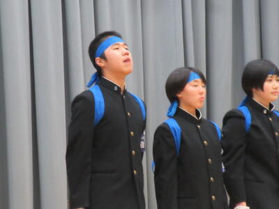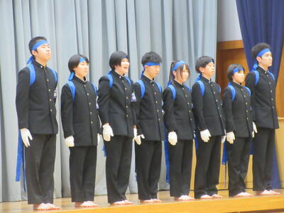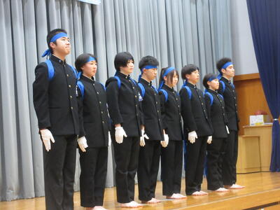 ▼勢揃いした新旧全校応援団。3年生からは感謝の言葉が、2年生からはこれからの意気込みが堂々と語られました。