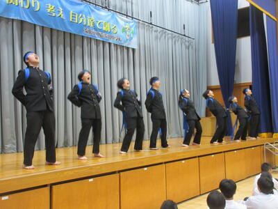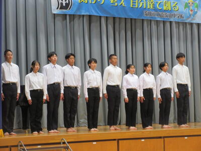 ▼新全校応援団による、これまで南流中を引っ張ってくれた3年生へのエールが送られました。新全校応援団員達も初めてとは思えない堂々たる、気合いの入った、見事な応援です!!