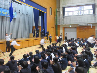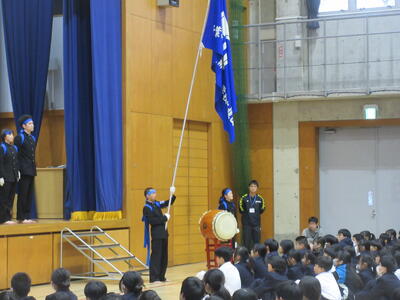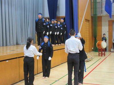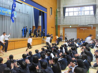 ▼新旧の全校応援団が勢いよく退場していきます。南流中の歴史に残る見事な「引き継ぎ式」もこうして幕を閉じました。
