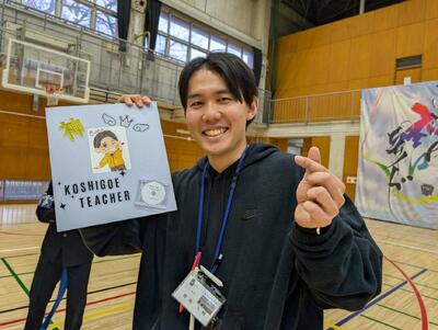 ▼全校生徒が退場した後の第1体育館では、全校応援団の指導を担当した腰越先生へ、団員達から感謝の色紙が贈呈されました。