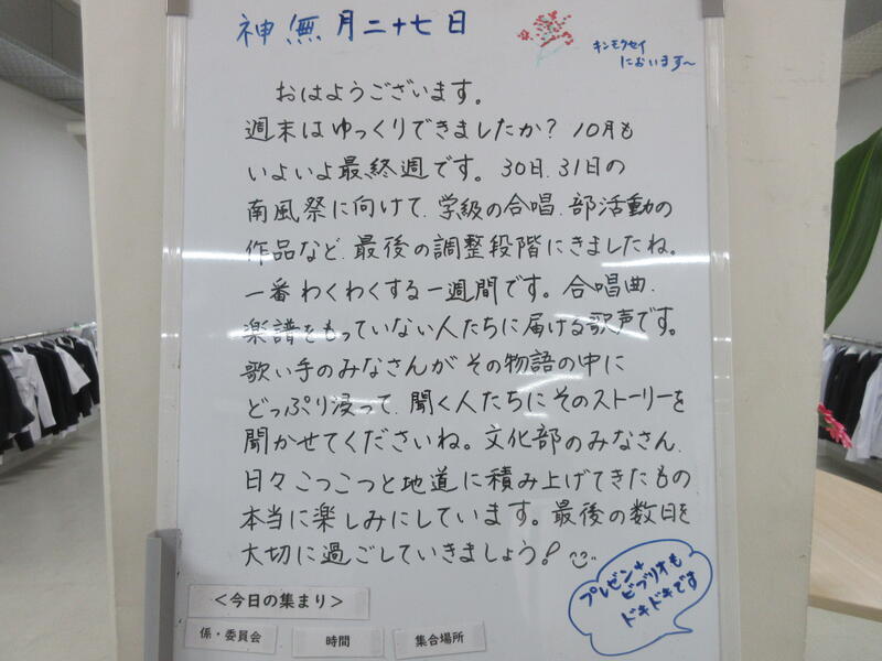 ▼C棟2階のホワイトボード。2学年主任の渡邉久子先生からのメッセージ。南風祭まで残り3日となりました。最高のものを創り上げてほしいですね!!