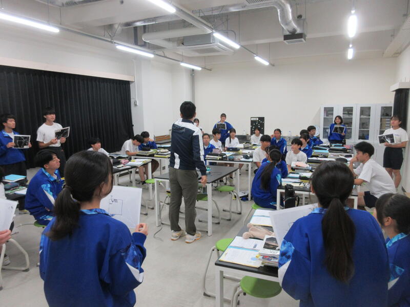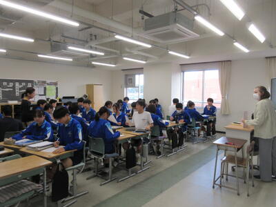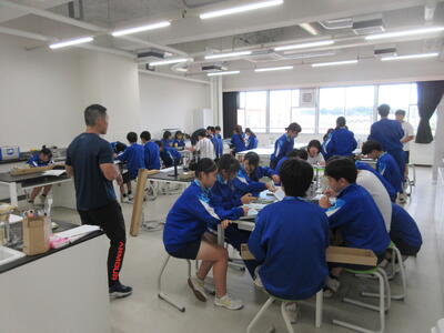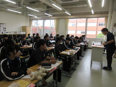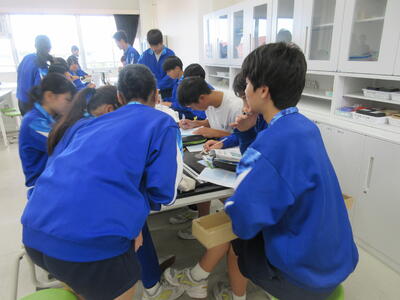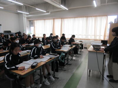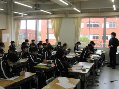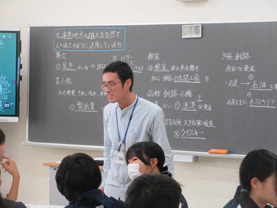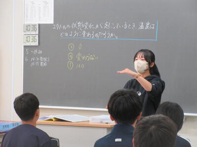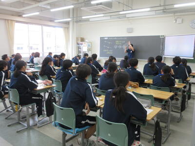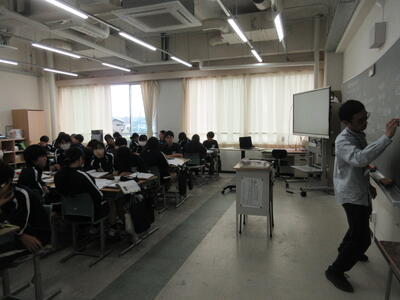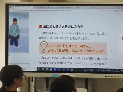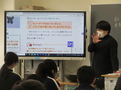 ▼2年生理科の授業。「スノーボードをはいていないと、どうして足が雪にしずんでしまうのだろうか」について学習が進められます。学校の勉強は、何らかのところで我々の身の回りの出来事に繋がっています。