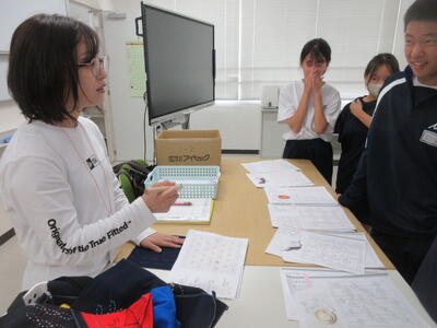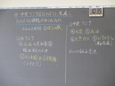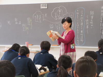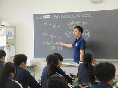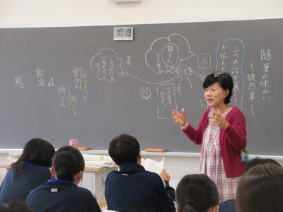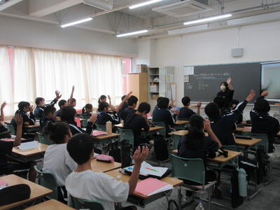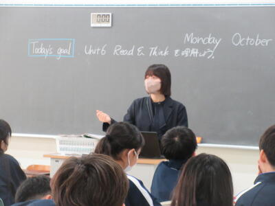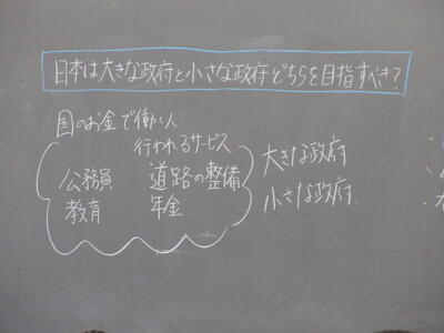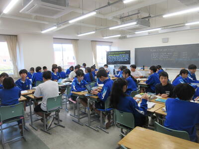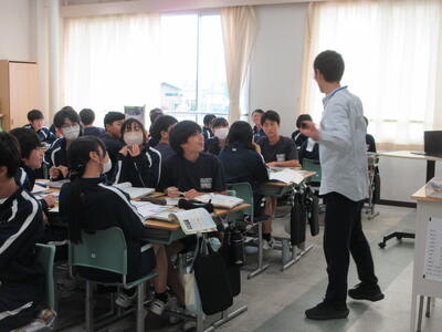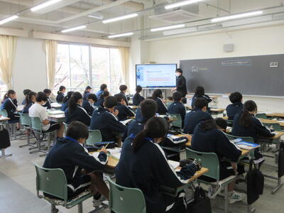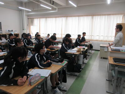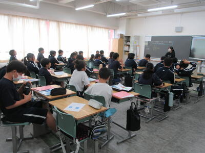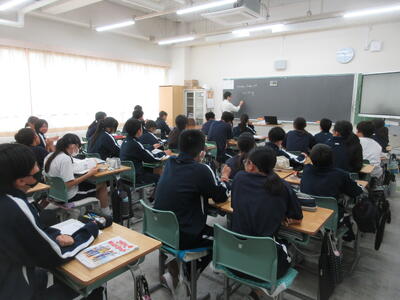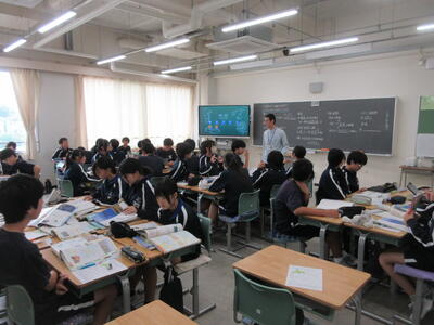▼3年生の社会科の授業。「世界幸福度ランキング」で消費税が25.5%を越えるフィンランドが、幸福度が高いのはなぜなのか、子ども達に問う渡邉里奈先生。子ども達も真剣に考えを膨らませます。社会問題に目を向けていくことも南流中が目指す「自立」への第一歩です。
