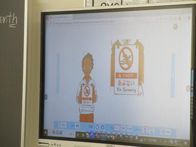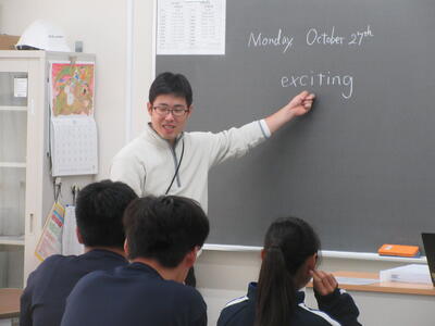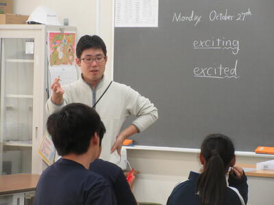 ▼1年生英語の授業。exciting と excited の違いを考える子ども達。野中仁人先生は、難しい内容も子ども達と対話しながら解きほぐしていきます。