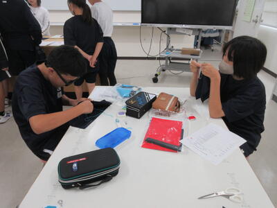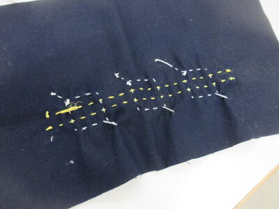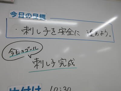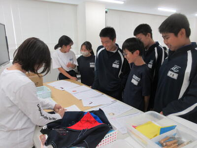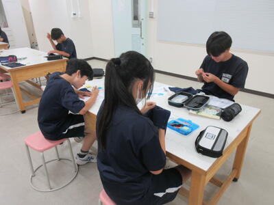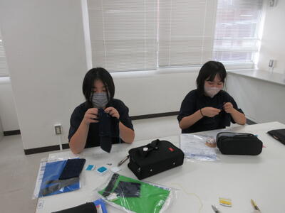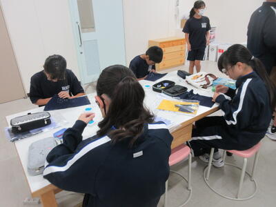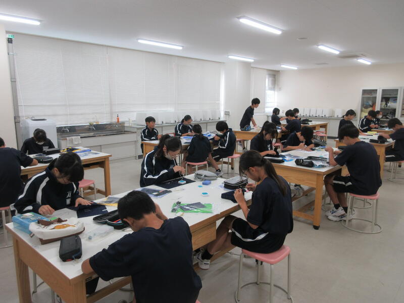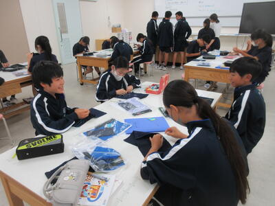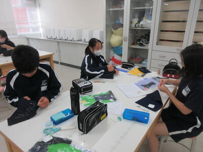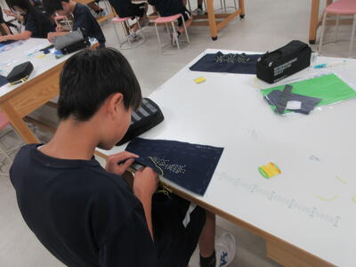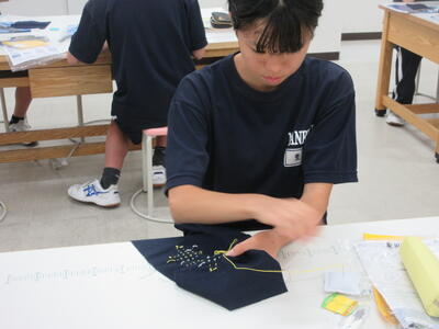 ▼被服室では1年生が家庭科の授業。刺し子に取り組んでいます。完成を目指すと言うことで集中力もマックスです!!