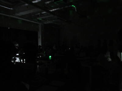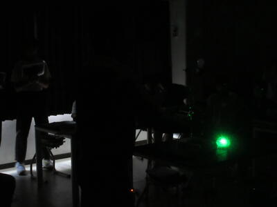▼第3理科室では、3年生が真っ暗な中で授業。プラネタリウムと化した教室内では、田中先生が星を投影しながら、授業を進めています。
