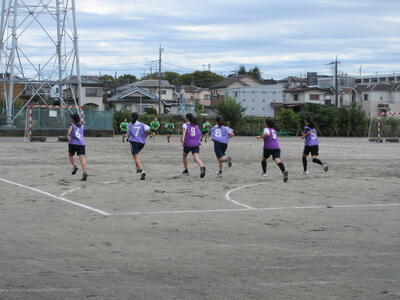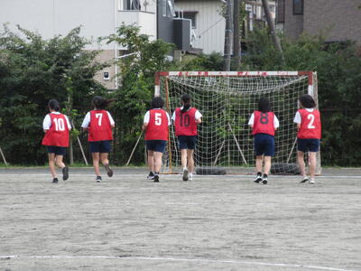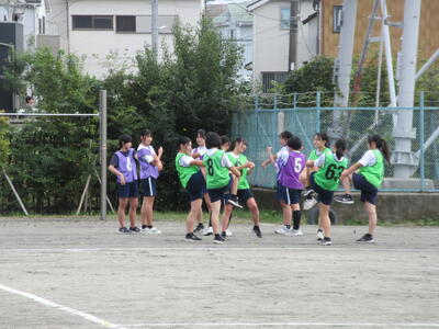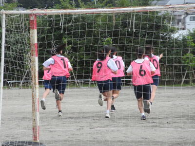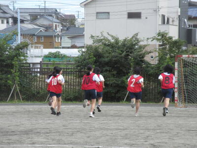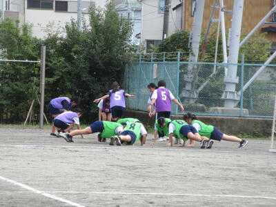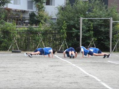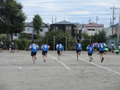 ▼第1グラウンドでは3年生の女子体育が行われています。元気なかけ声が響き渡ります。運動系部活動も引退した子ども達は、この体育の時間が楽しくて仕方がないようです。きつい筋トレやダッシュも楽しそうな表情で行っています。