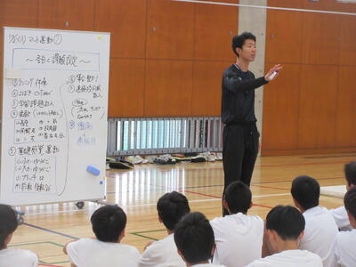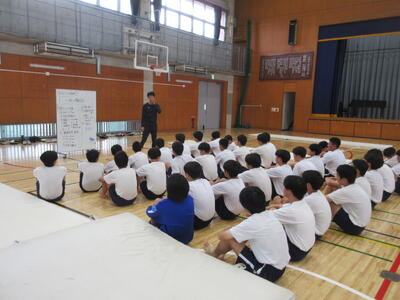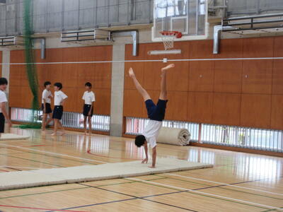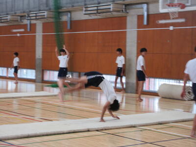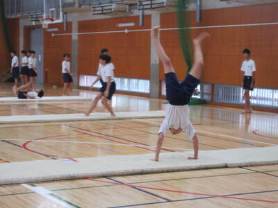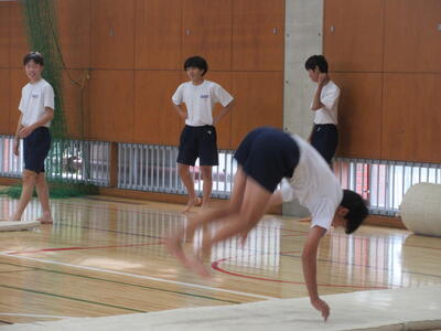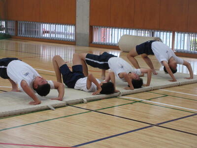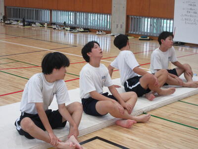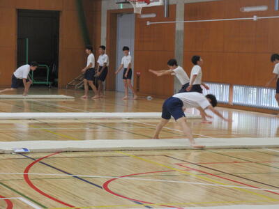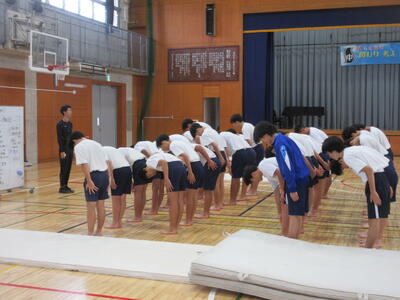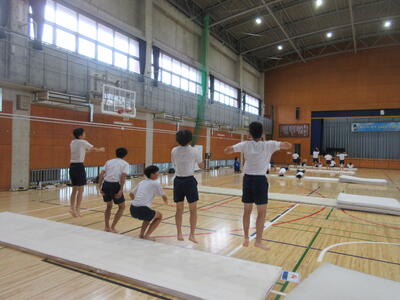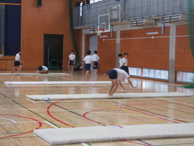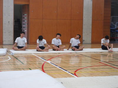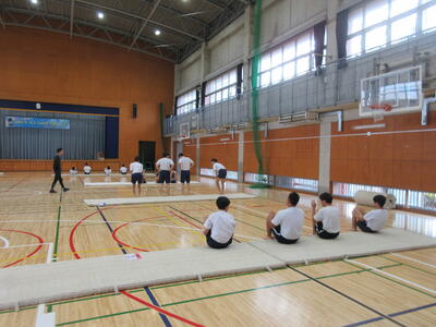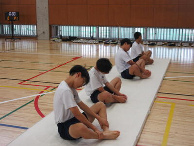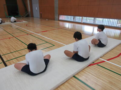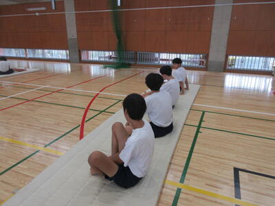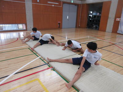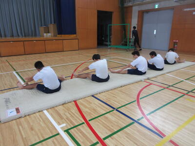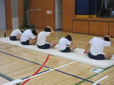 ▼第1体育館では、3年生の男子体育。マット運動の準備体操が行われていました。