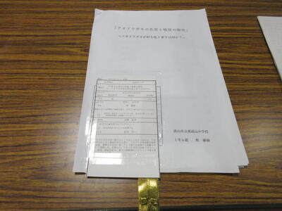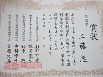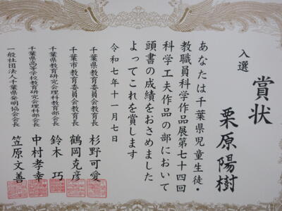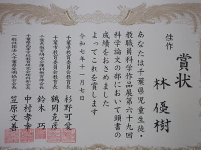 9月13日と14日に行われた「流山市小中学校科学作品展」(→詳細はこちら)にて最優秀賞に輝いた本校生徒3名の科学論文と工夫工作が、先月開催された「千葉県児童生徒・教職員科学作品展」に出品されました。
