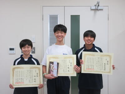 その中から工藤漣さん(1年)の「セミの本当に好きな木を探せ!と流山市のクマゼミ調査5」が奨励賞に、また、林優樹さん(1年)の「アオドウガネの色覚と臭覚の研究~アオドウガネが好む色と香りは何か?~」が佳作に、さらに栗原陽樹さん(2年)の「自動卓球球出し機」が入選に輝き、賞状や記念品が手渡されました(→受賞者一覧はこちら:千葉県総合教育センターHPより)。おめでとうございます!!