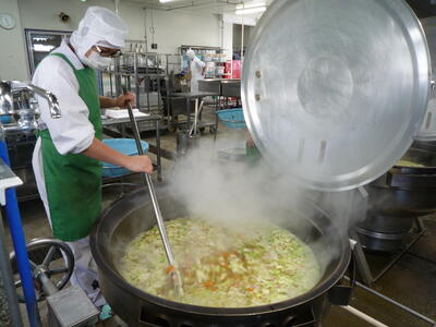 ポテトスープのじゃがいも(44㎏)を切っているところとスープを作っているところ。