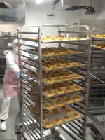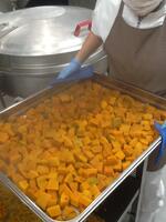 米粉のりんごケーキには、缶詰のりんごと生のりんごを使います。材料を全て合わせると、40kg以上になりました。カップの大きさは、全学年同じですが、流し込む量を学年に応じで変え差をつけます。焼き上がって粗熱を取ると、米粉ならではのしっとりもっちりとした生地に、りんごの香りと甘み、酸味がよく合い、おいしく仕上がりました。