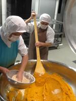 黒糖大豆は、黒糖と少しの水を加熱したところに炒り大豆を入れて、水分を飛ばしながら手早くひたすら混ぜます。これが結構重労働。息を切らしながら、混ぜてくださいました。水分が無くなり、パラッとしたらできあがりです。おいしくいただきました。